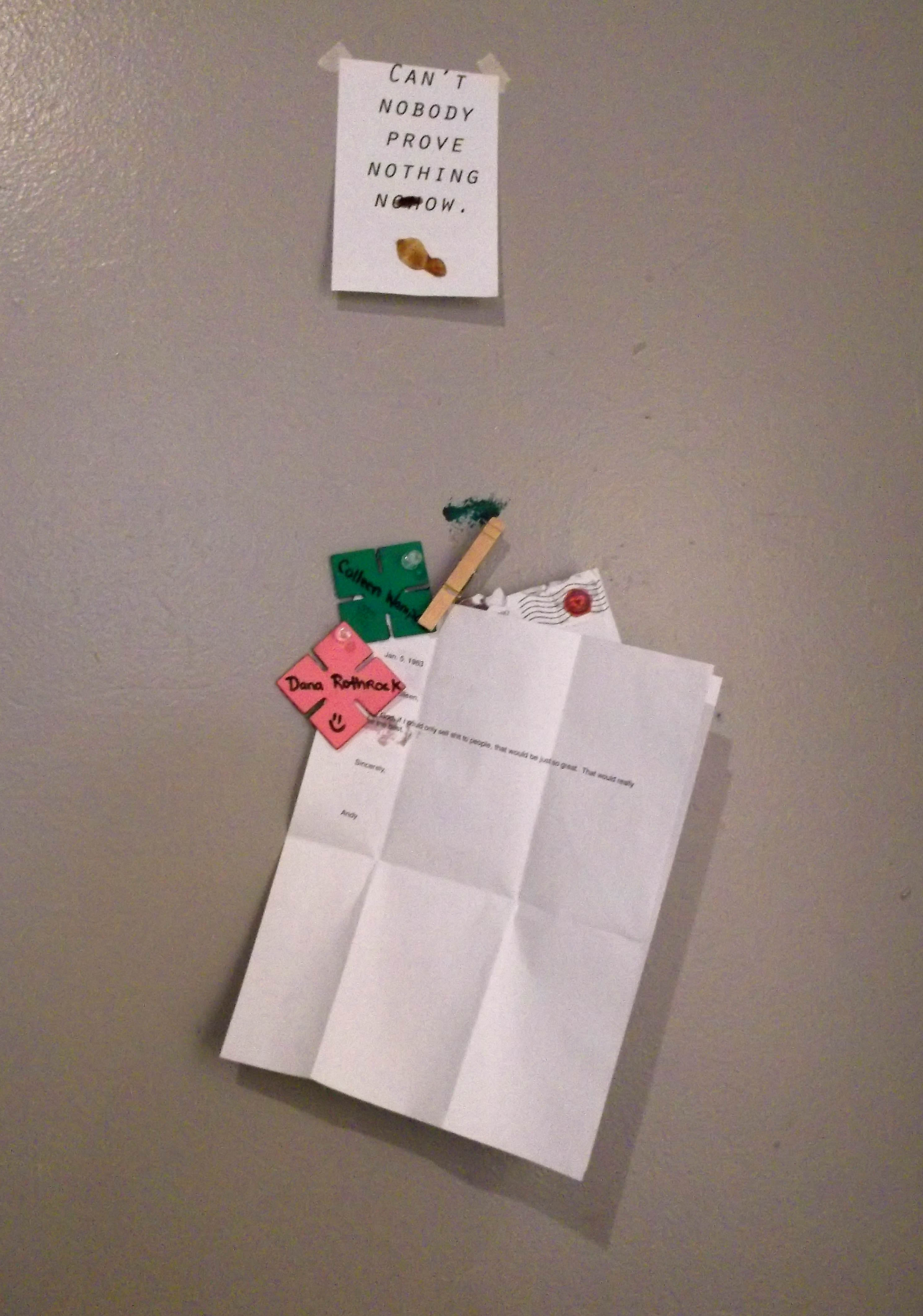 A significant part of my studio work this summer took the form of a light-hearted prank. I wanted a puckish rather than stinging tone, which took a lot of planning since I rarely allow myself the liberty of pranking. Doing so this summer was part of a desire to set up more interactive and collaborative art, as well as to incorporate humor more openly into my work. The collaboration was both with Brian Kubecki, without whose influence the entire project would have been much more boring, and the classmates who received and reacted to the letters.