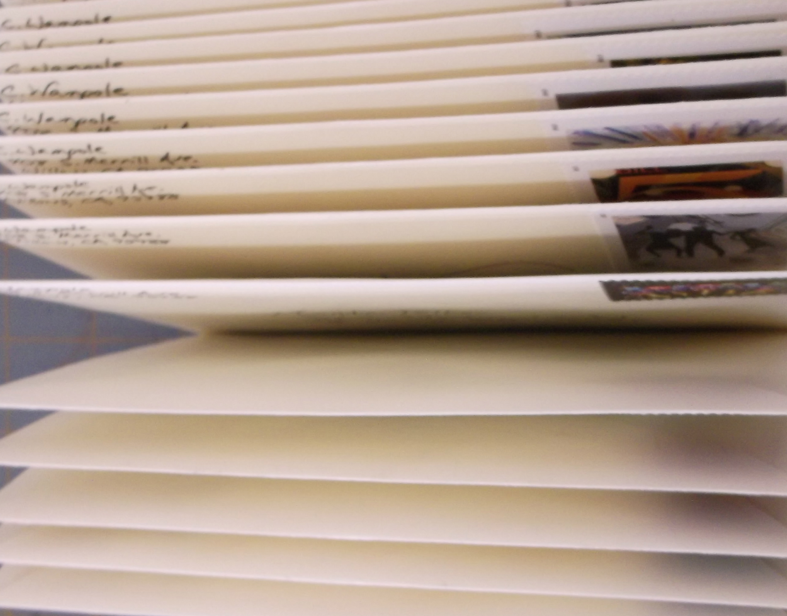 I have committed to sending out at least one round of mail art each month, but I have neither sketches nor mock-ups for the next round.  Why?  I want it to be a response to the communication (or lack thereof) and experiences (or lack thereof) during the interval between mailings.