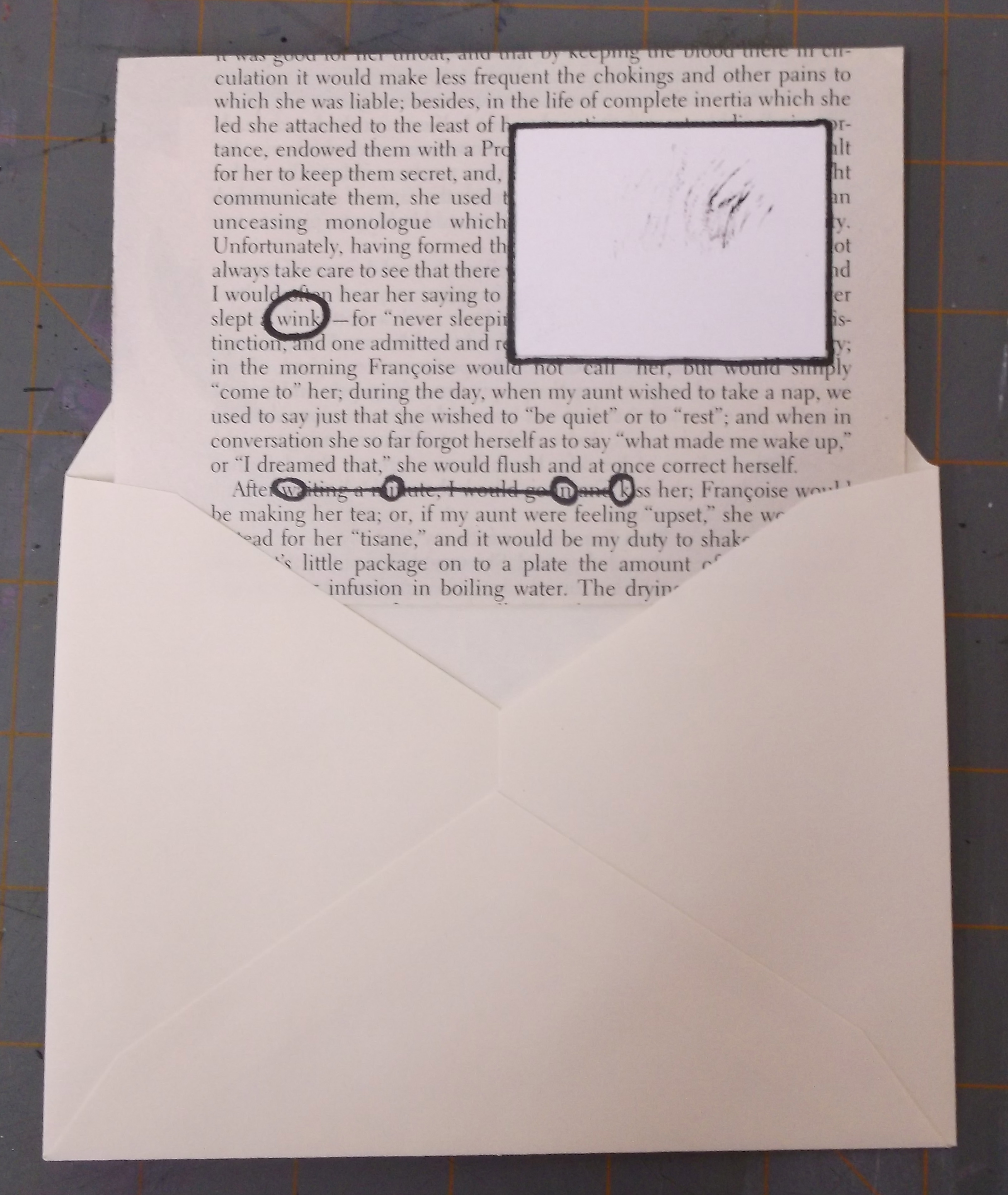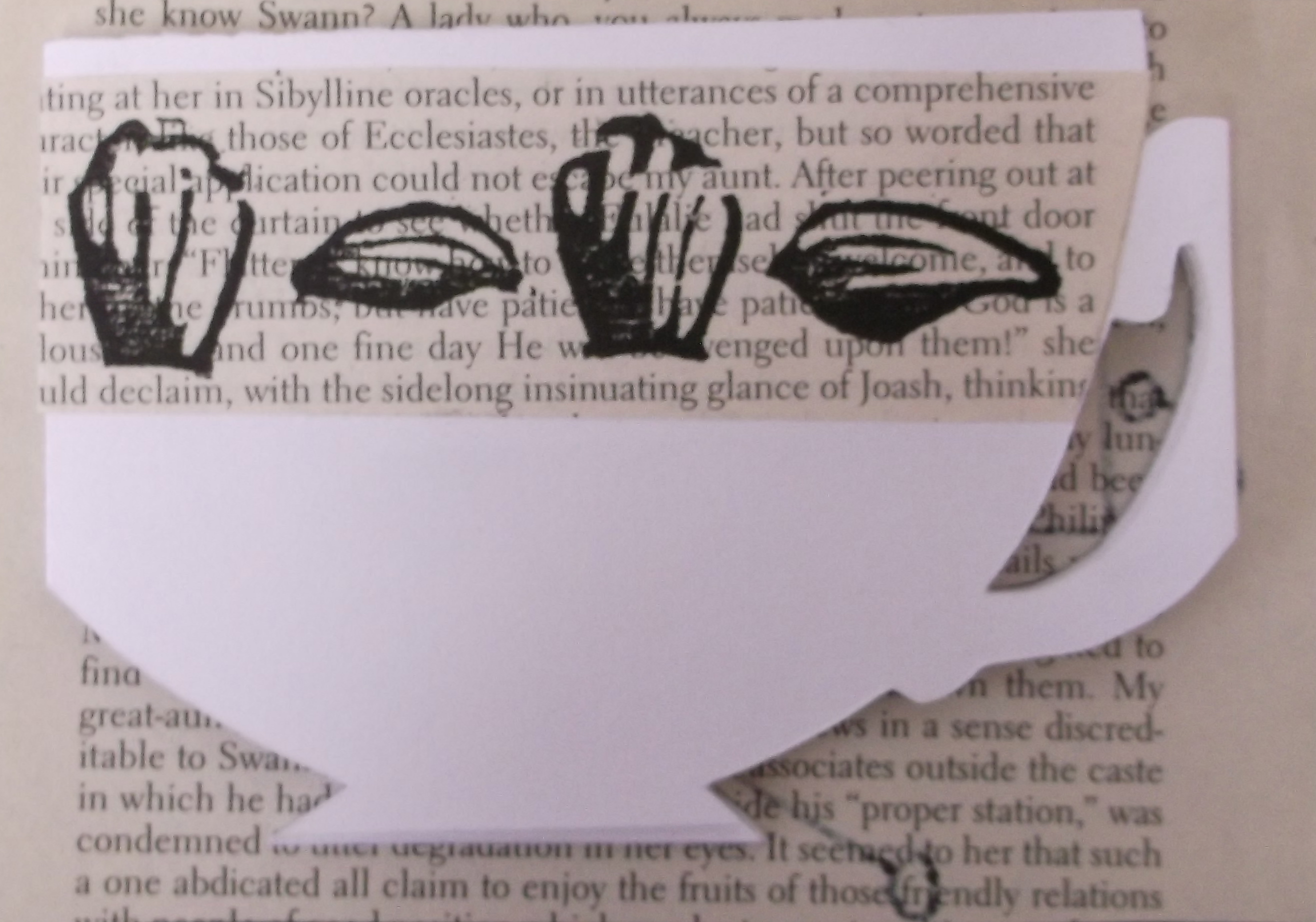 Each card was both part of a series and unique.  The closest term I can think of is the printmaking monotype.  Even the woodcut relief prints of shell-shaped madeleines were slightly individual because each was printed on a different page from Marcel Proust’s Remembrance of Things Past (Vol. 1:  Swann’s Way).  It contains the famous madeleine passage.