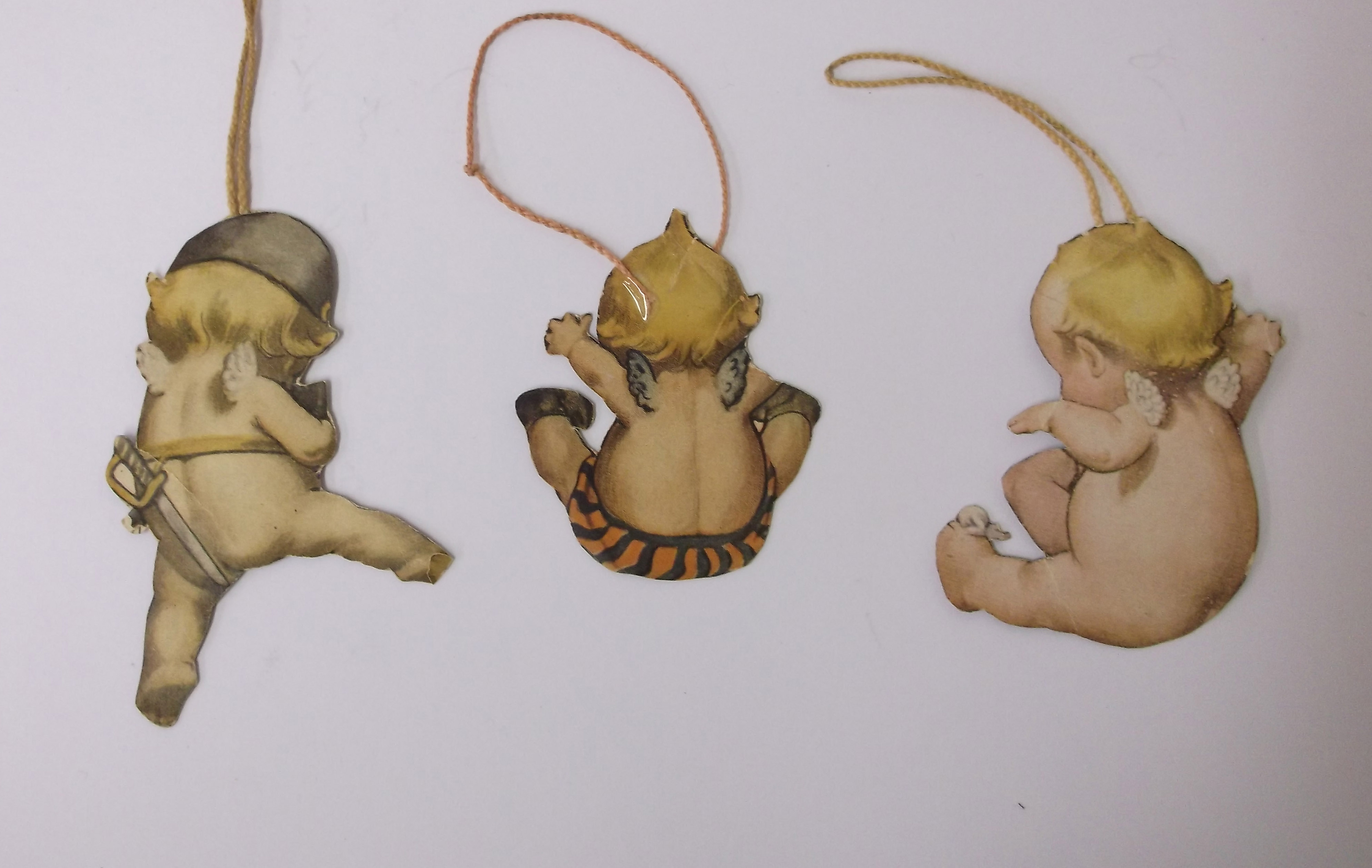 These are a few of the “Kewpie Kut Outs” that graced my family’s Christmas trees since I was a very young person. My grandmother cut these illustrations out of a magazine, glued them together, and left them to us. We continue the tradition because connections to absent family are far more important than elegant pretensions.