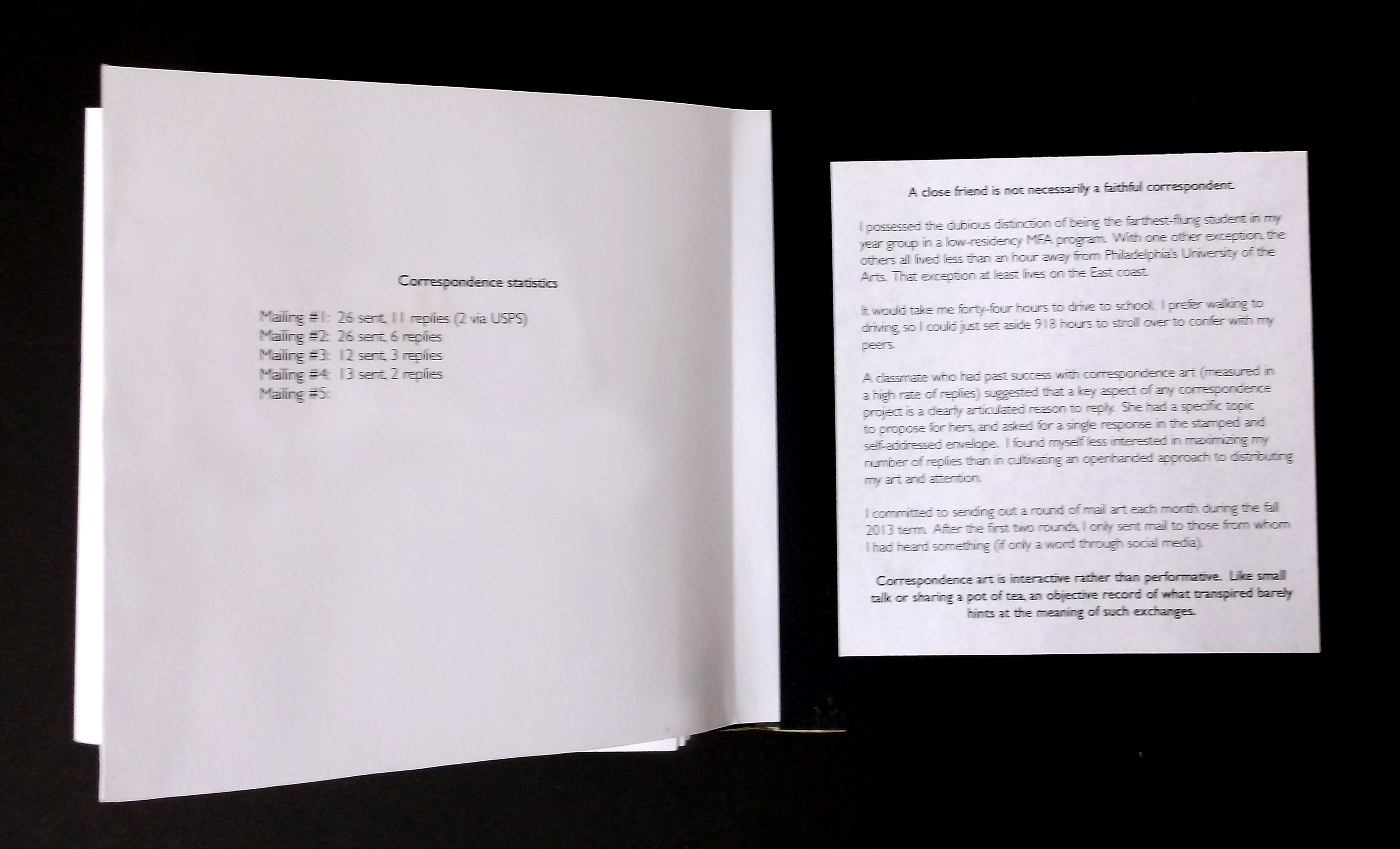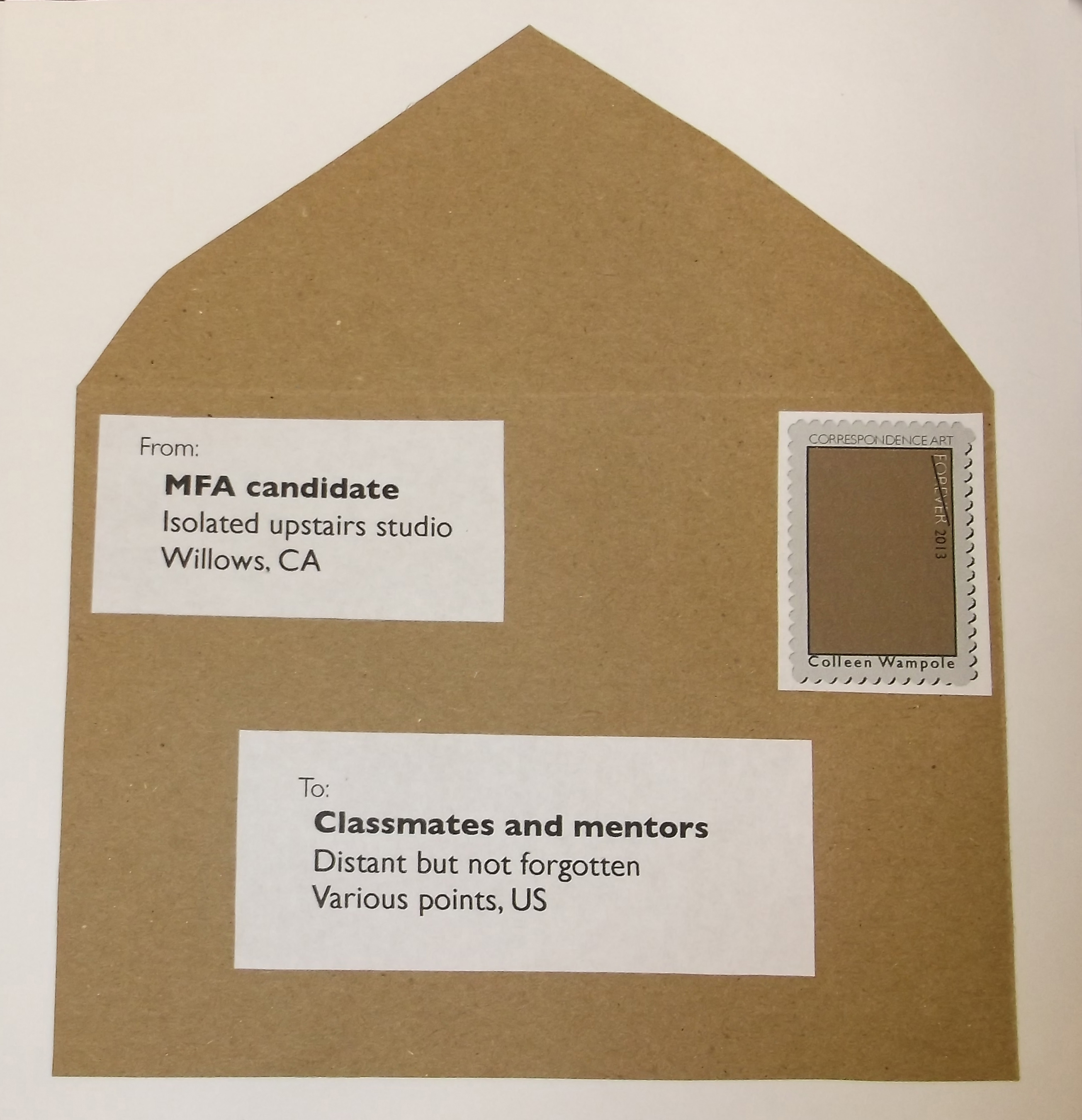 Correspondence art (mailed out five times during the semester) will allow an outlet for experimentation and spontaneity. I usually term this work a hobby rather than art, but is that snobbery or necessity? At the very least, it valuable to maintain communication with my peers while we are 3,000 miles apart.