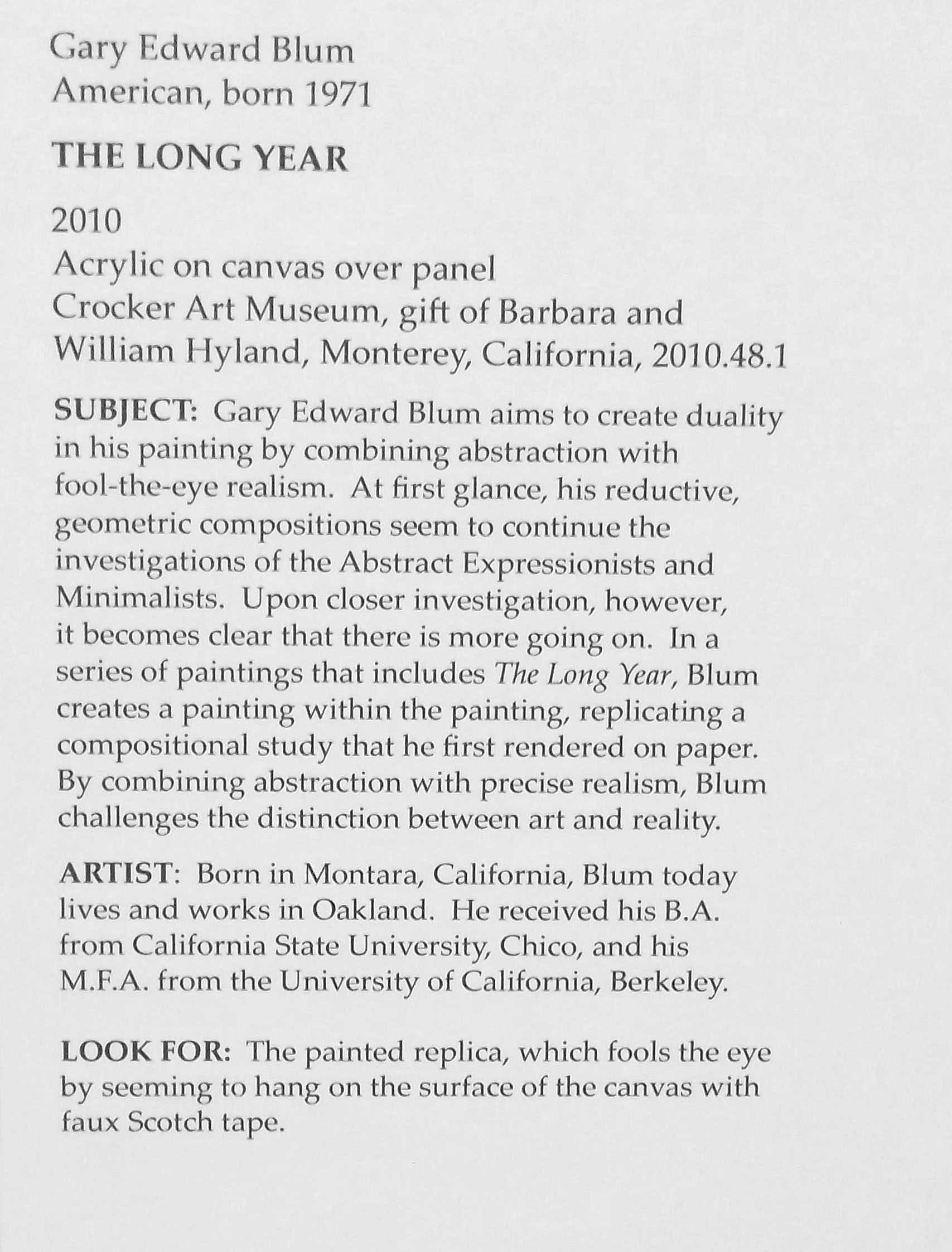 The signage format for the Crocker Art Museum had an obvious formula, but that formula made information readily accessible and validated the artist who made the work, the content of the work itself, and the role of the viewer.