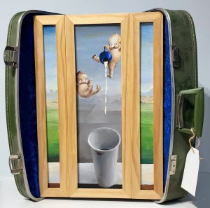 This extremely portable triptych reflects the fact that we carry our highly subjective understanding of the past into the present and future. The Kewpies (designed by Rose O’Neill in the early 20th century as playful comic figures with an enduring kitsch legacy) are the most straightforward nostalgic element of this artwork. Repurposing luggage as a literal framing element aligns the entire exercise of nostalgia towards the kitsch and away from the sublime. For those of us who ignore frames in favor of paintings, their central colorfulness and flanking black and white panels can nod to the iconic use of color in The Wizard of Oz.