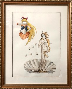 This pair of paper doll costumes comes from a series of symbolic anachronisms. The paper doll format alludes to the ways in which culture influences self-image. In this set, the painted costumes invite comparisons between Sandro Botticelli’s Birth of Venus and Naoko Takeuchi’s Sailor Venus. How much or little change has happened in the way we think about the power of female beauty and love? In what ways are these stories empowering, and in what ways can archetypes limit our expectations?
