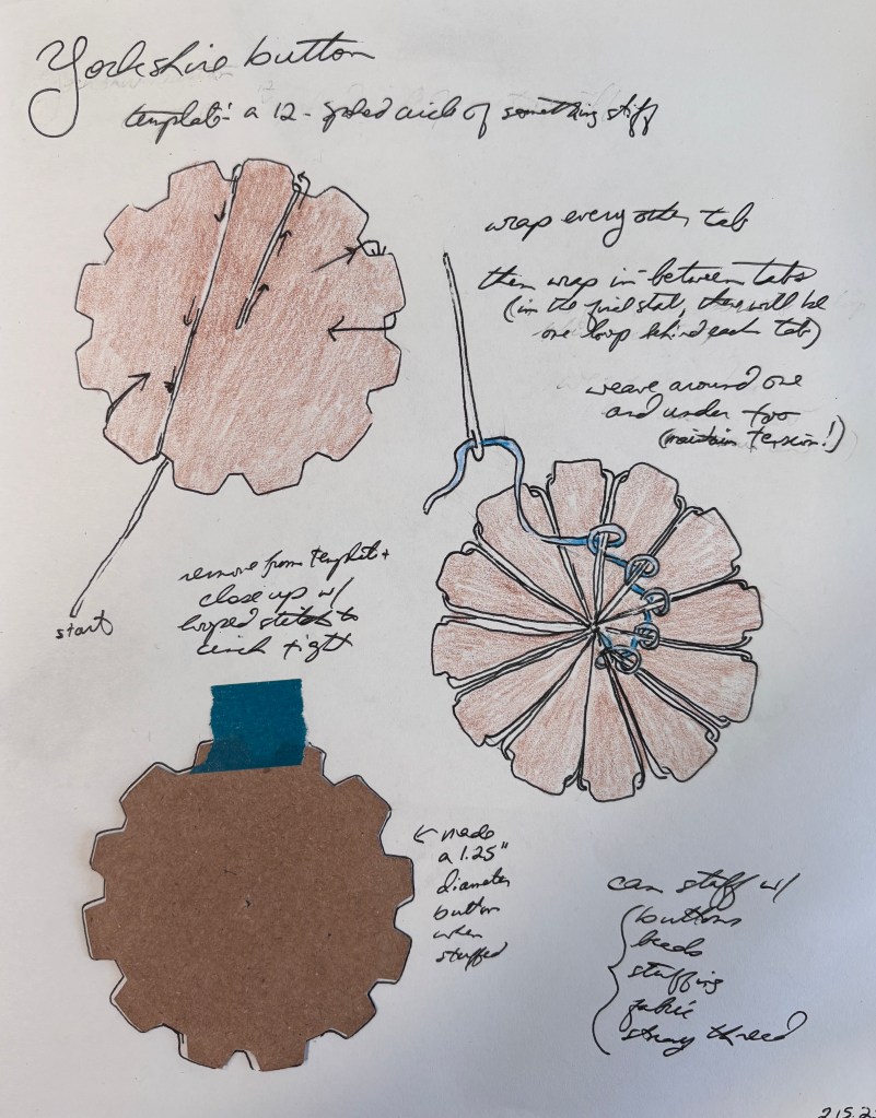 I’ve wanted an excuse to make buttons out of thread for ages. I did something inspired by these videos on how to make a Yorkshire button and how to modify that process to make a stuffed sort of bobble.