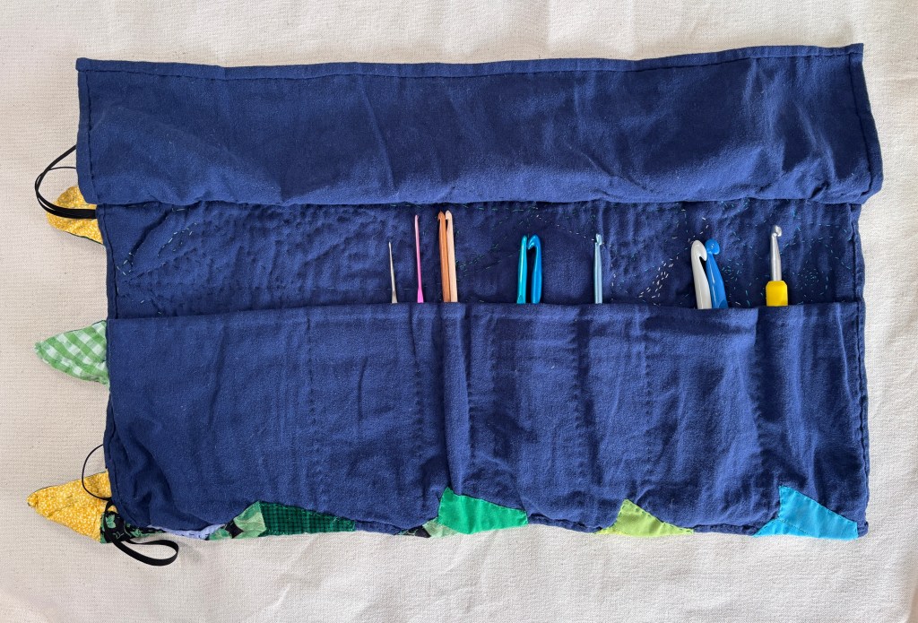 I sewed some channels into the lining fabric and then carefully sewed the lining to the quilted ivy. The extra flap overlaps the tool pockets and should prevent them from falling out during transport. My photos only show crochet hooks in this tool holder, but it is meant to carry a variety of lace-making supplies as well.