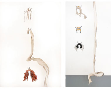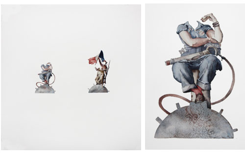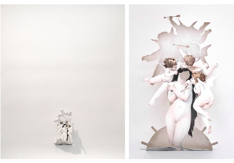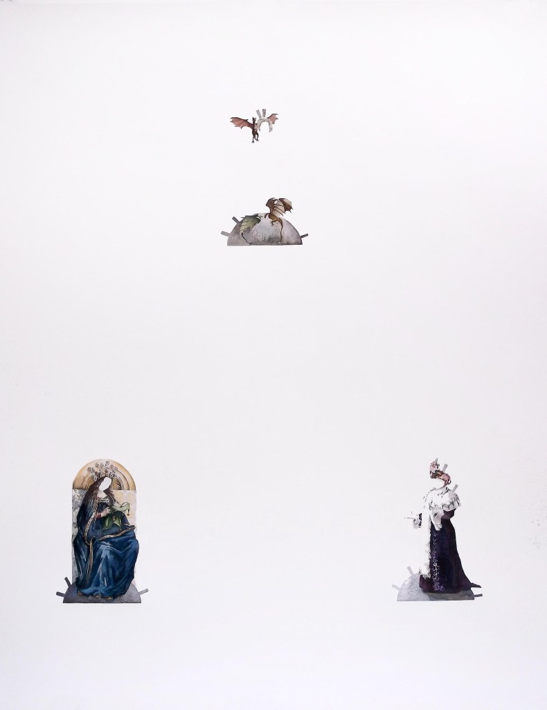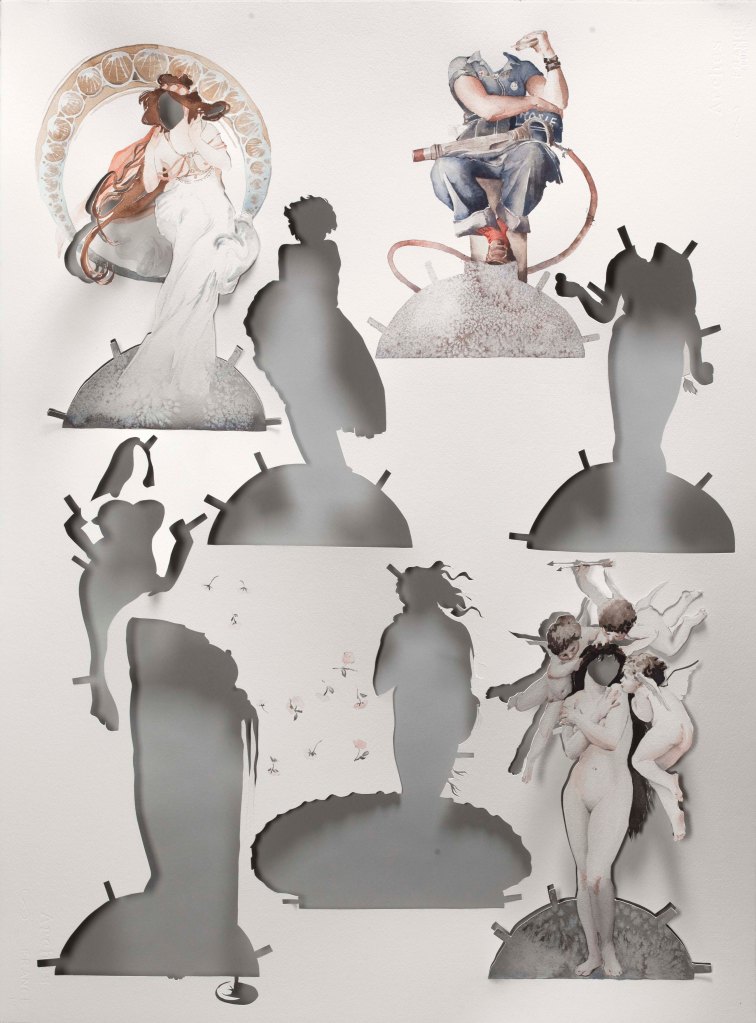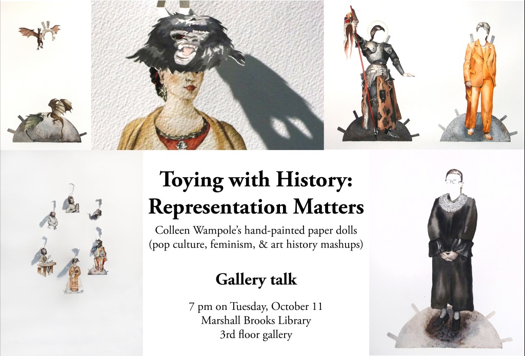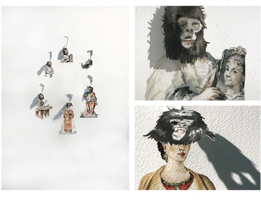 Paper doll series: Toying with History (completed) MFA thesis project in which meticulously painted watercolor shrinks and transforms famous depictions of women in art history as though they were paper doll clothes for a young person to use to construct identity or stories